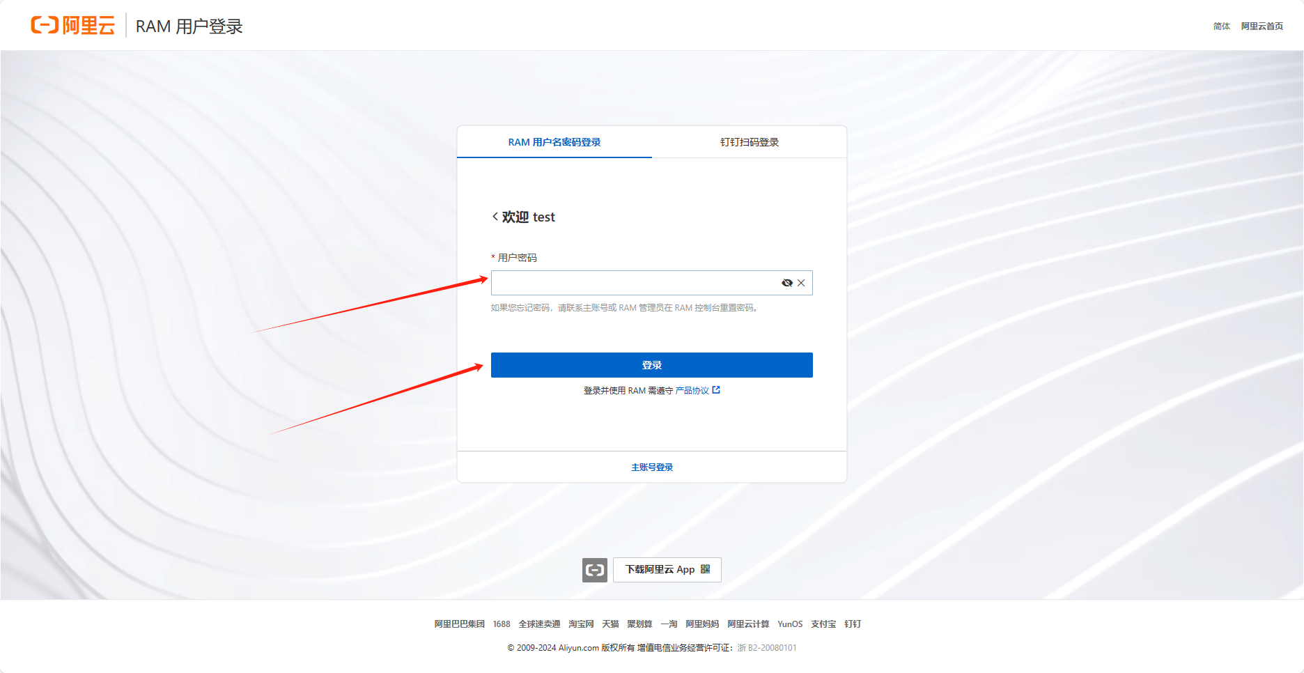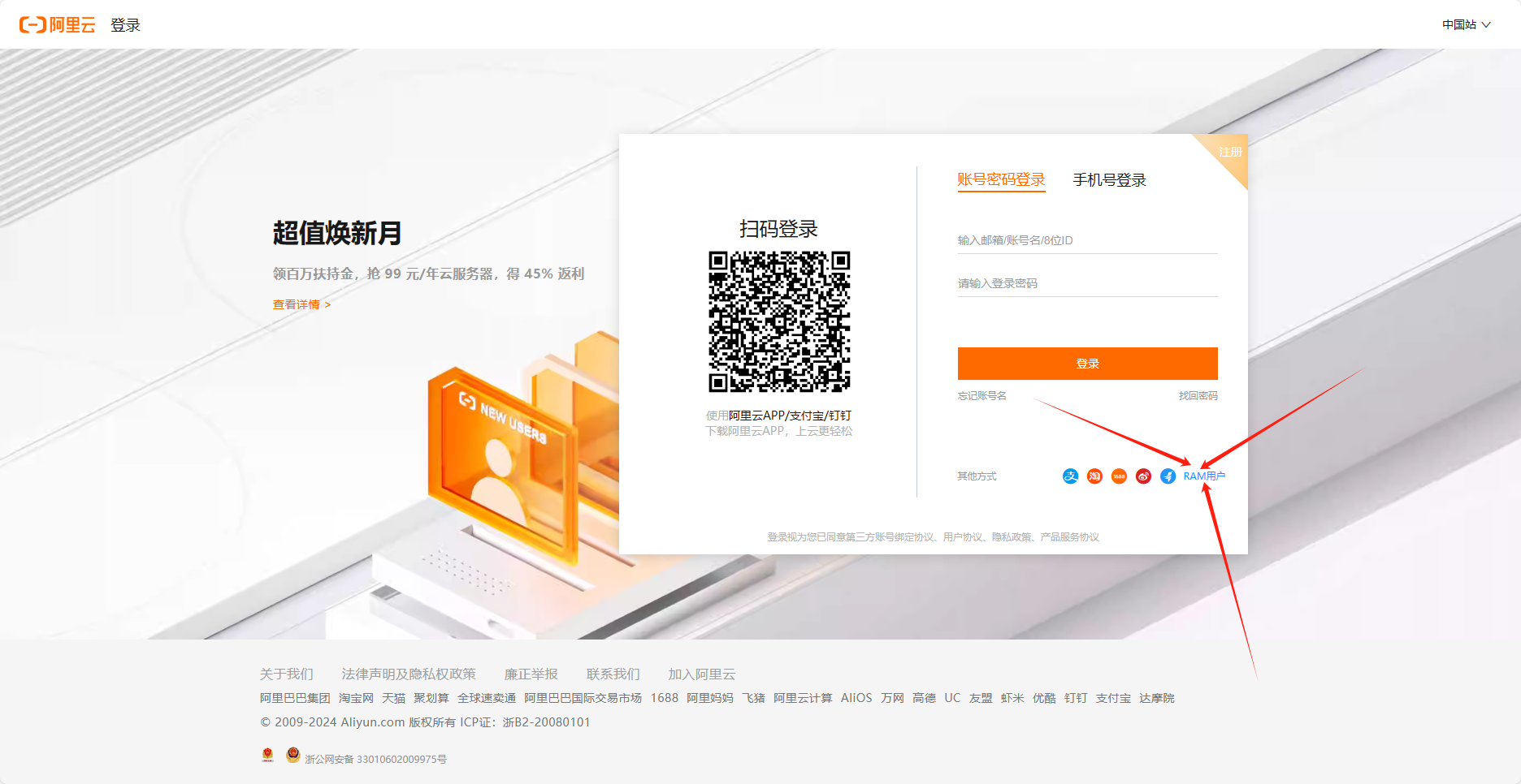 点击红色箭头标识处的”RAM用户”,进入RAM用户登录页面,如下图: