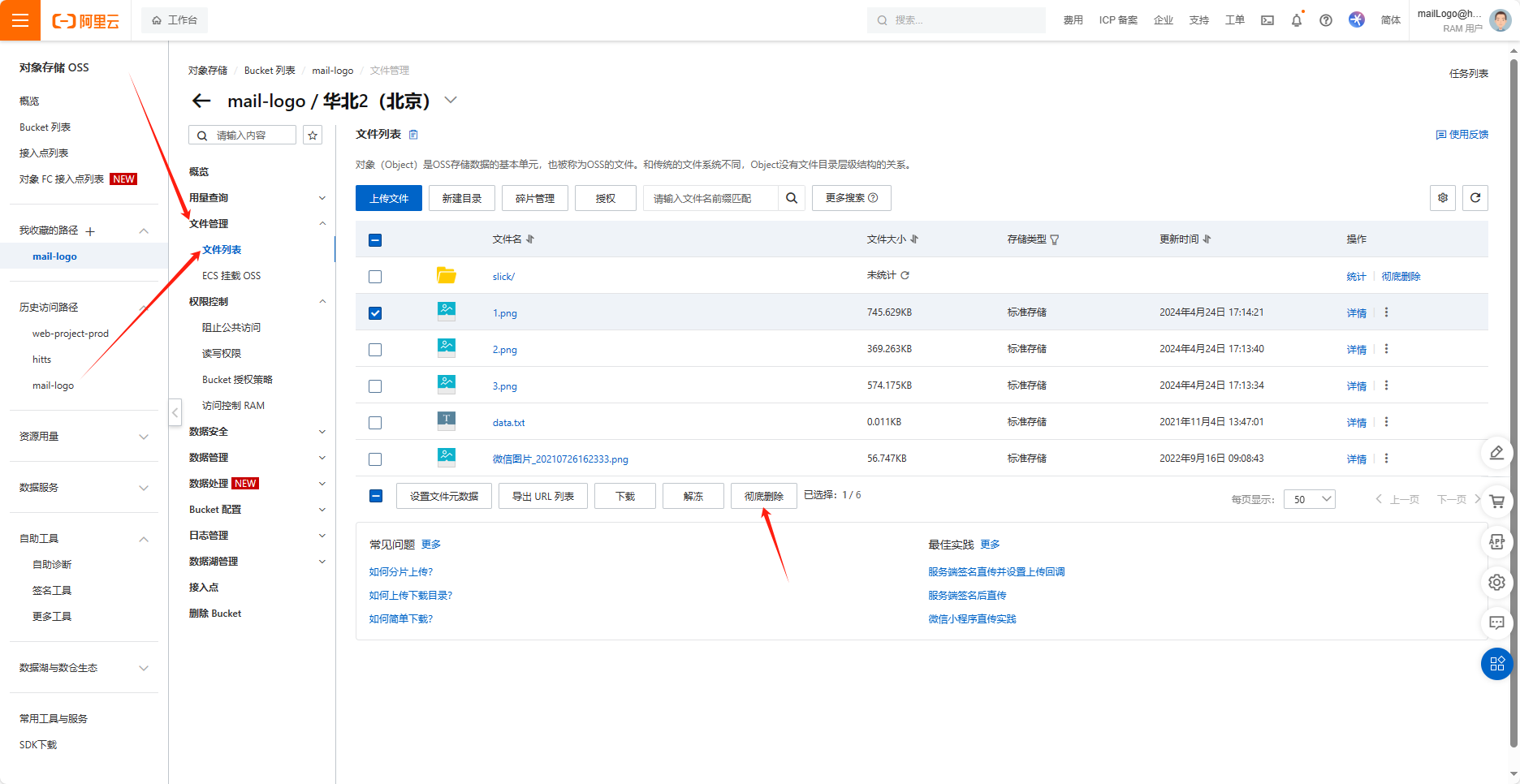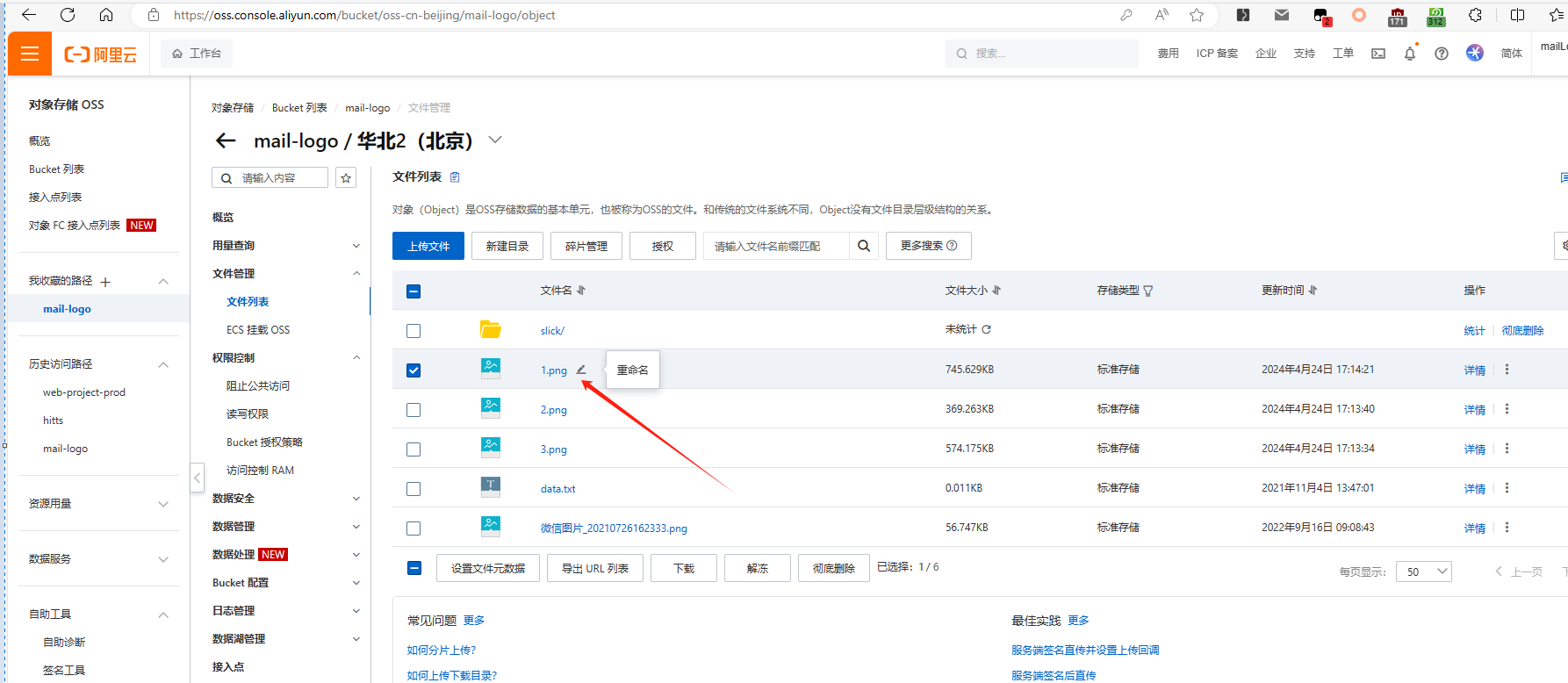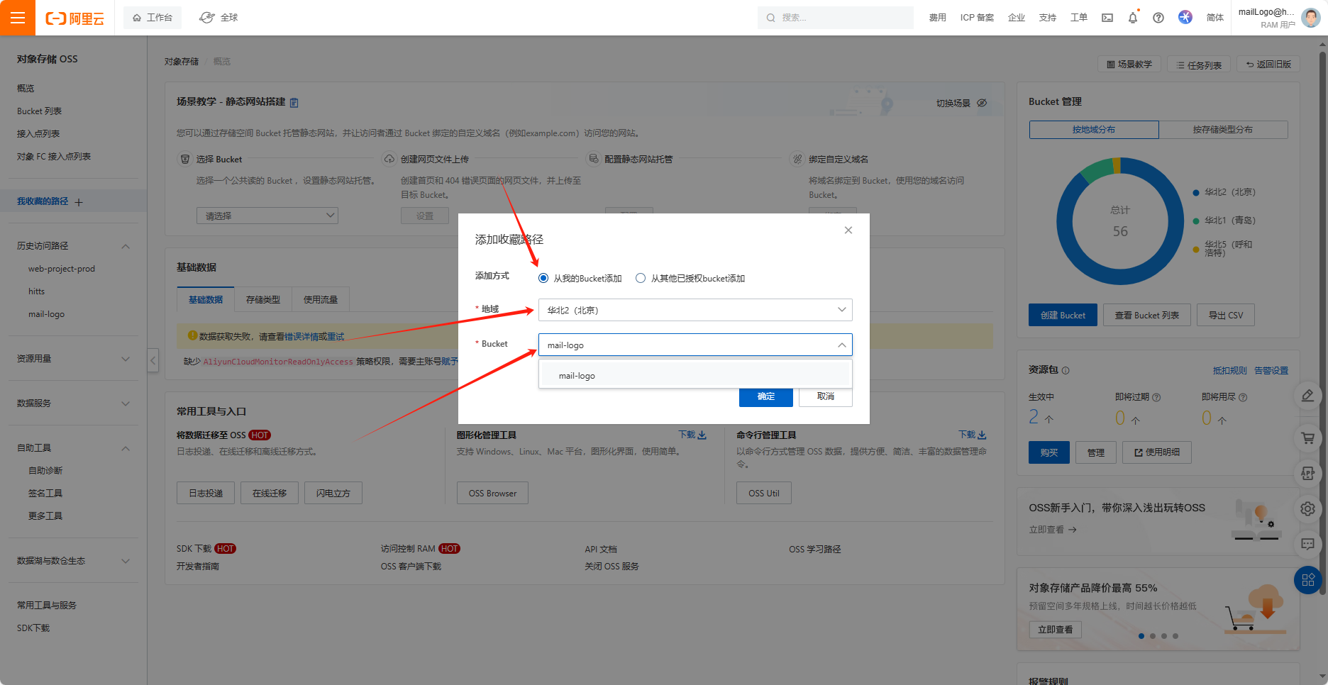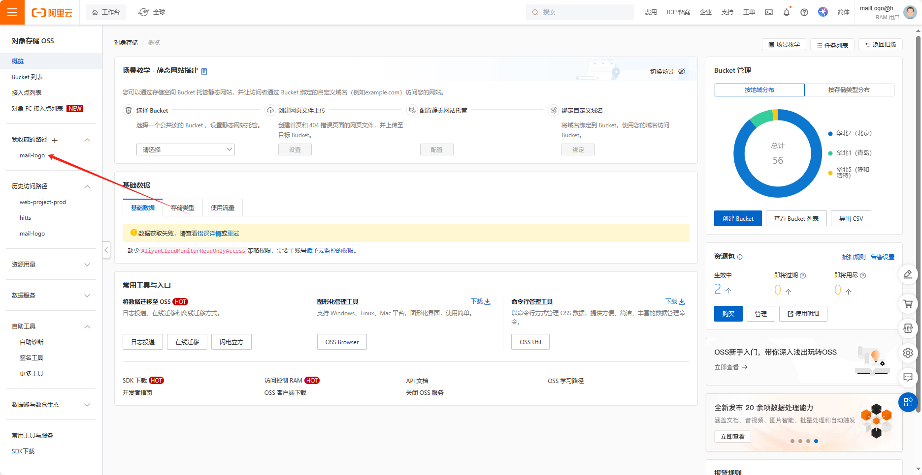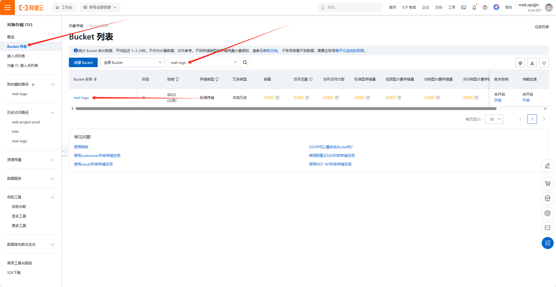 登录后进入,控制台页面,点击左侧的“Bucket列表”,在搜索框中输入:mail-logo,如下图: